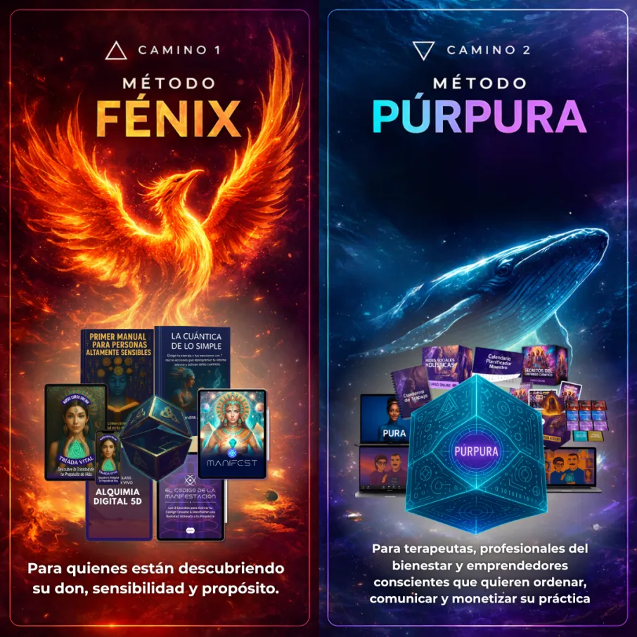 El Método Fénix es el inicio: te ayuda a reconectar contigo y entender tu don. El Método Púrpura es la expansión: te guía a estructurarlo y convertirlo en un proyecto real.